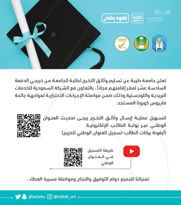 الـ قـ بـ ول و التسجيل Na Twitteru تعلن جامعة طيبة عن تسليم وثائق التخرج لطلبة الجامعة من الدفعة السادسة عشر لمقر إقامتهم مجانا بالتعاون مع الشركة السعودية للخدمات البريدية واللوجستية لتسهيل